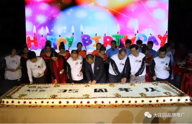 長(zhǎng)3米5的35周年生日蛋糕推至臺(tái)前,它代表莊園35年的事業(yè)步步高升,蒸蒸日上。現(xiàn)場(chǎng)700余名員工集體合唱《生日歌》,并且大莊園全體員工為董事長(zhǎng)準(zhǔn)備了一棵由每一位莊園員工的指紋組成的莊園樹。“一棵樹,一家人”代表著所有莊園人在大莊園這棵大樹下吸取養(yǎng)分,茁壯成長(zhǎng)。