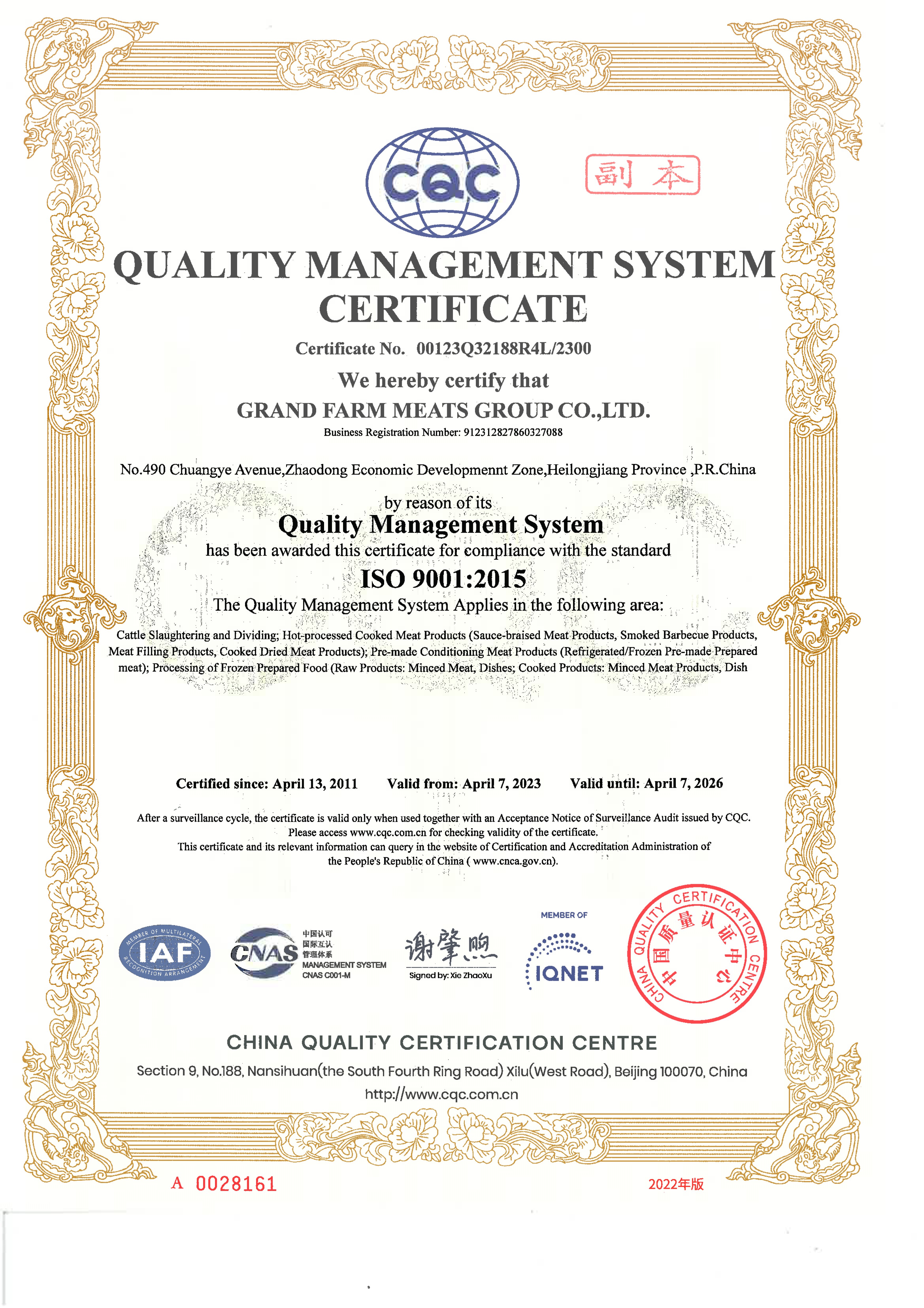 食品安全管理體系認(rèn)證證書(ISO22000)中文