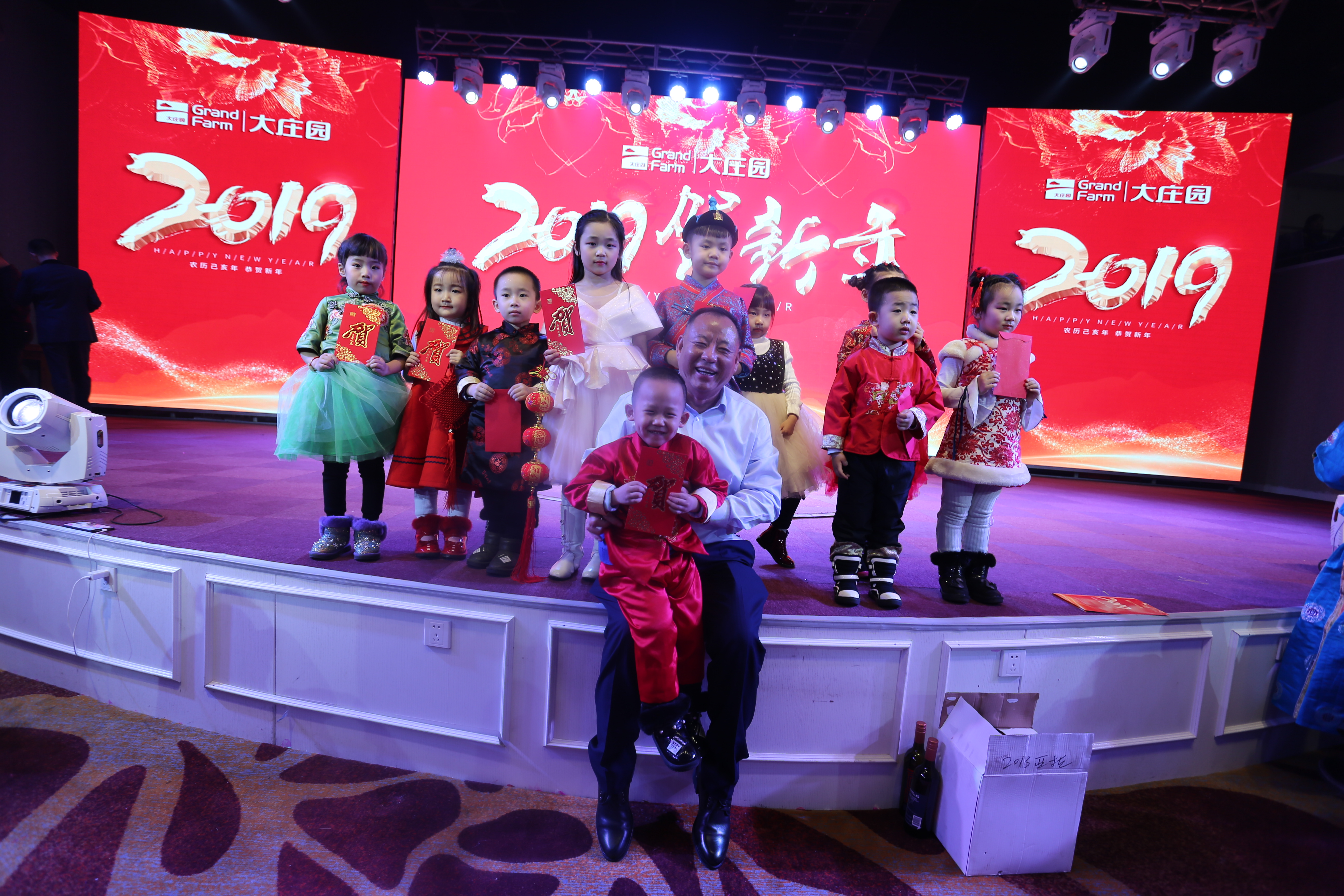 晚會的第一個高潮出現(xiàn)在董事長致辭之后的歌曲聯(lián)唱《莊園獻(xiàn)禮》,聯(lián)唱的最后,當(dāng)10名莊園萌寶手拉手從幕后走出,用他們稚嫩的聲音大聲喊出“祝陳爺爺身體健康,大家新年快樂,Happy New Year”的時(shí)候,瞬間點(diǎn)燃了全場的氣氛,自然而然的,他們都得到“陳爺爺”親手送出的紅包。