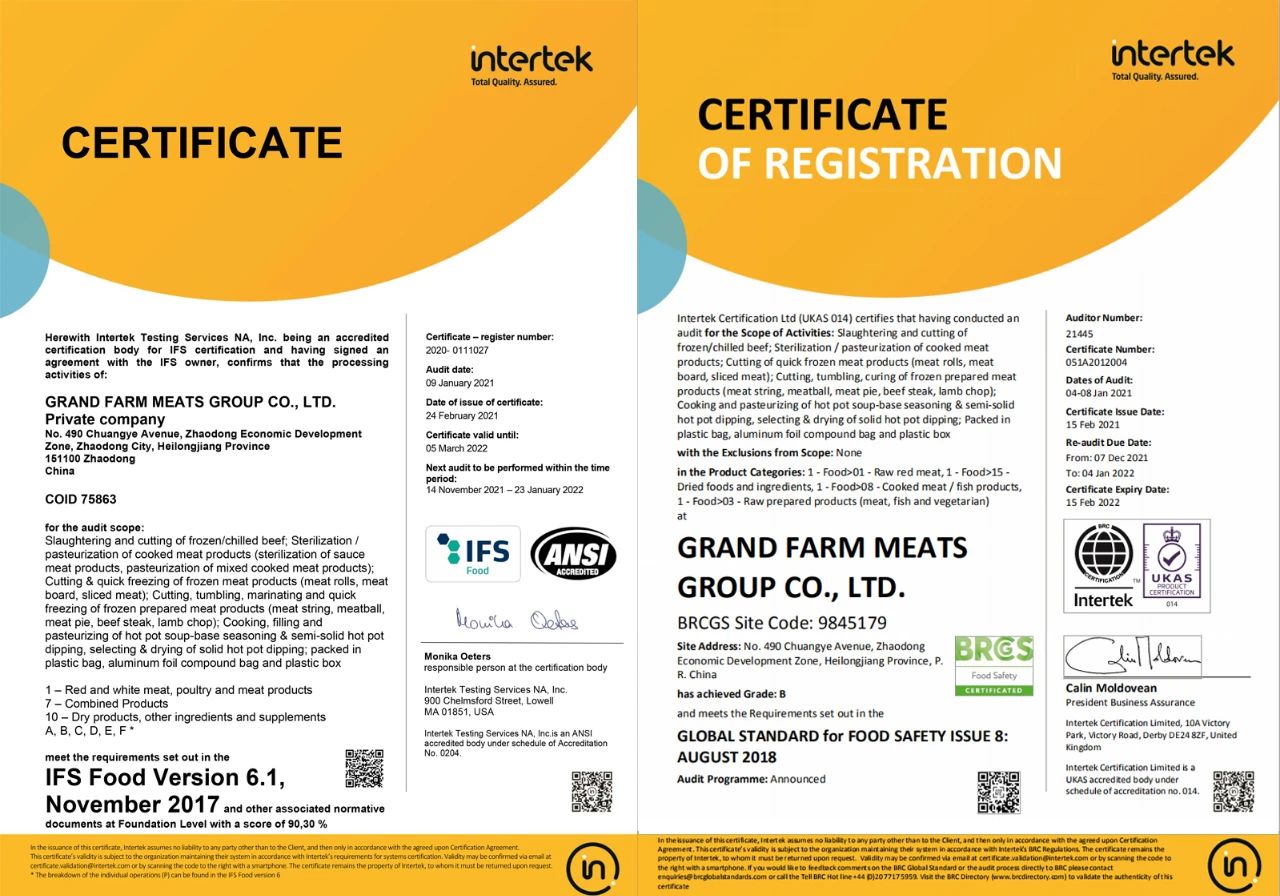 2021年2月25日,大莊園順利通過BRCGS(食品安全全球標(biāo)準(zhǔn))、IFS(國(guó)際食品標(biāo)準(zhǔn))兩大國(guó)際食品標(biāo)準(zhǔn)認(rèn)證,成為國(guó)內(nèi)畜類及牛羊肉行業(yè)第一家通過歐洲國(guó)際雙體系質(zhì)量認(rèn)證的企業(yè)。